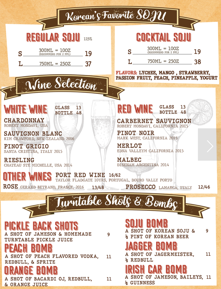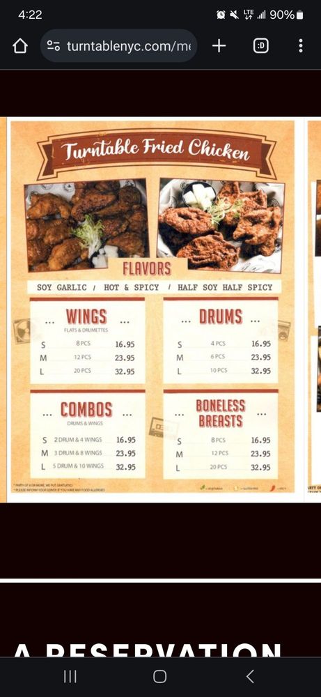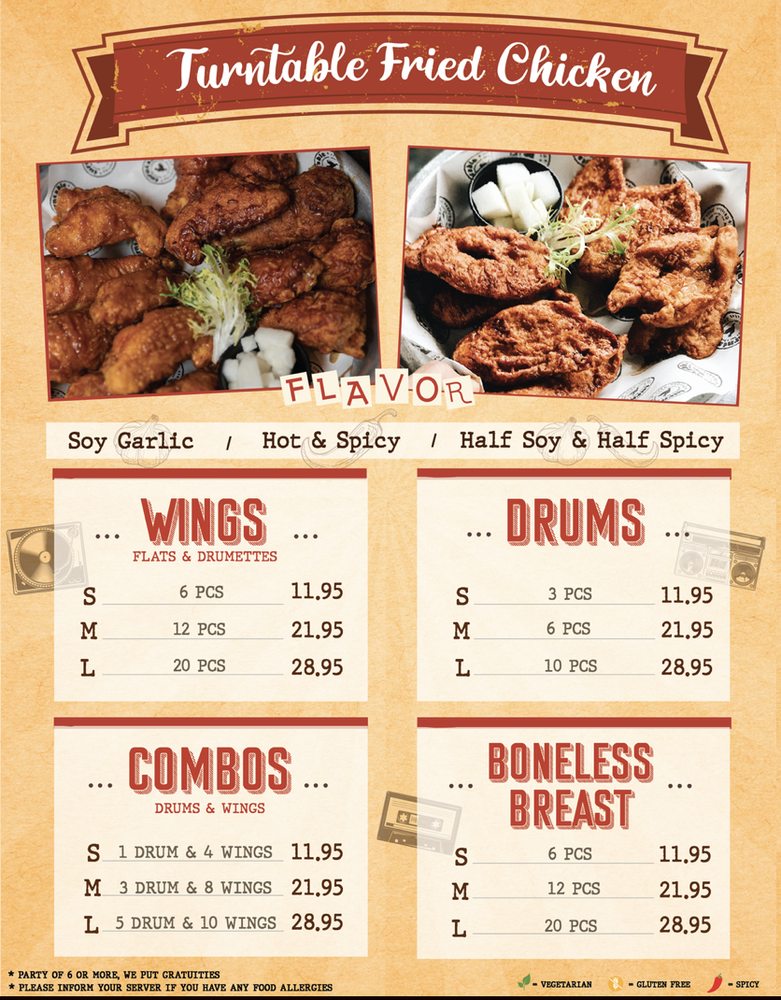 Introducing the menu at Turntable Chicken Jazz, a trendy and casual spot in New York City. This restaurant offers a variety of Korean fried chicken wings, known for being flavorful and satisfying. With options like honey BBQ and spicy wings, paired with tasty sides like corn cheese and truffle Parmesan fries, the menu is sure to please your taste buds. The venue boasts a cool retro decor, perfect for group gatherings and late-night dinners. While the chicken may not be the most groundbreaking, it consistently delivers on flavor. With a diverse range of utilities like outdoor seating, waiter service, and a full bar, Turntable Chicken Jazz provides a vibrant dining experience for those looking to enjoy delicious Korean cuisine in a lively atmosphere.